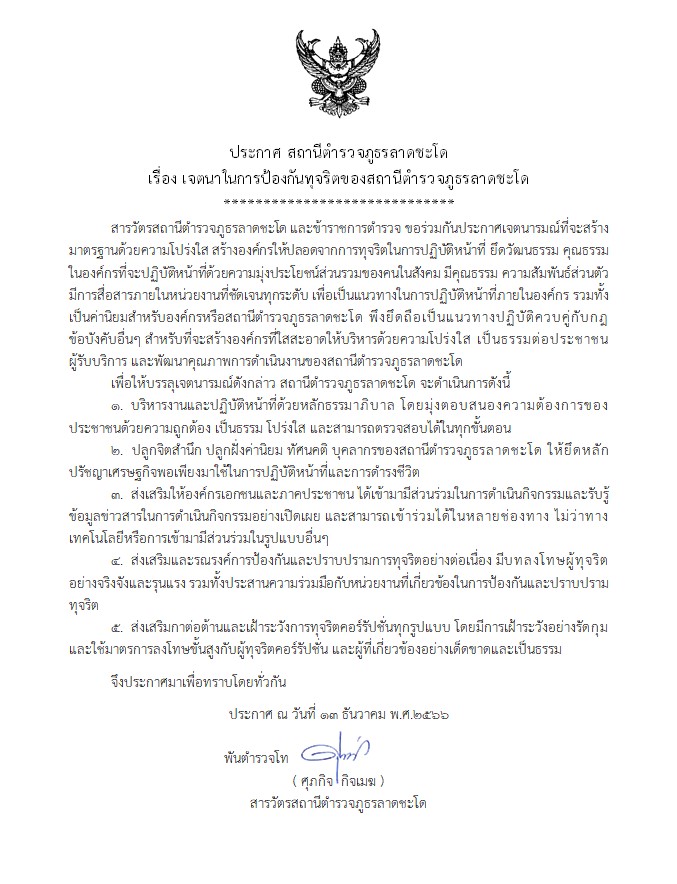 พ.ต.ท.ศุภกิจ กิจเมฆ สว.สภ.ลาดชะโด ประกาศเจตนารมณ์ของหน่วยงาน ประกาศเจตนารมณ์ในการป้องกันการและต่อต้านการทุจริตชองสถานี และประกาศเจตนารมณ์ไม่รับของขวัญและสินบนอื่นใดทุกชนิดจากการปฏิบัติหน้าที่ ในหน่วยงาน