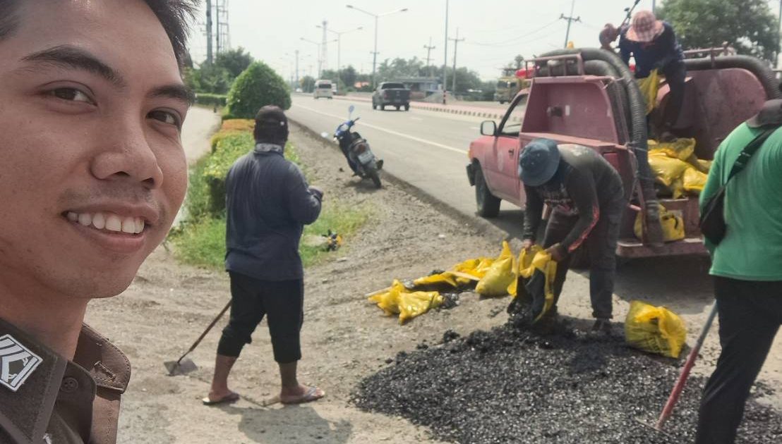 จ.ส.ต.คเณศ พวงมะลิ เจ้าหน้าที่จราจร สภ.ลาดชะโด ได้ประสานเทศบาลตำบลลาดชะโด ในการปรับปรุงพื้นผิวการจราจร บริเวณทางแยกเข้าบ้านลาดชะโด ถนนสุพรรณบุรี – ป่าโมก