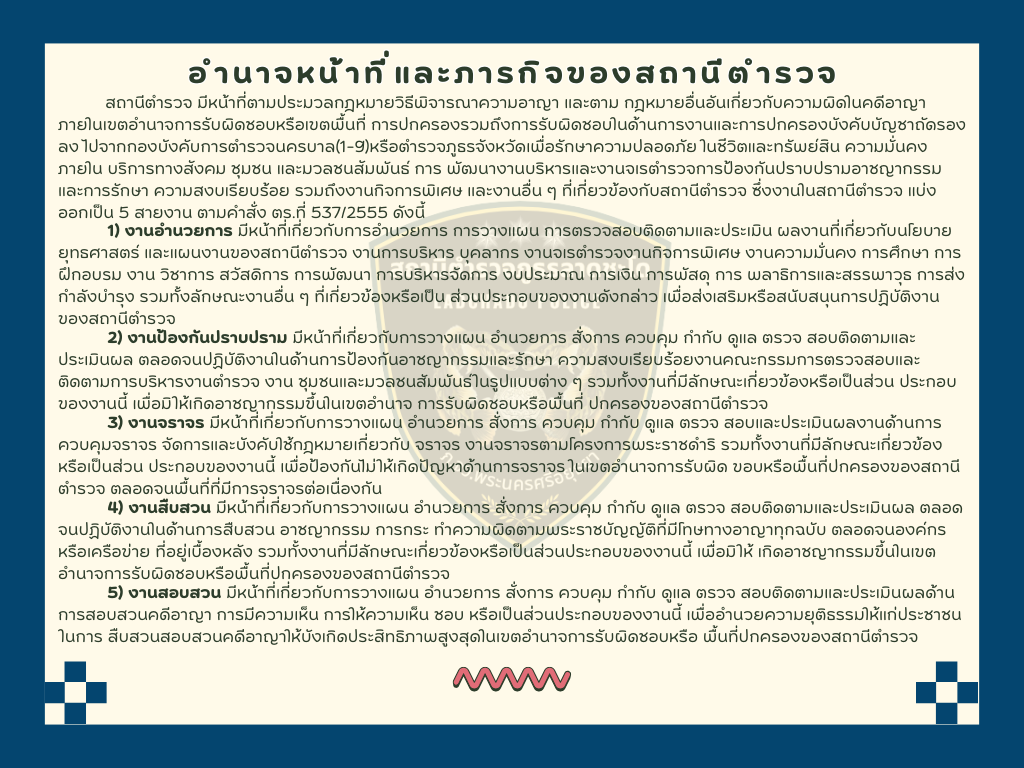 • ประกาศสำนักงานตำรวจแห่งชาติ เรื่อง การกำหนดเขตอำนาจการรับผิดชอบหรือเขตพื้นที่การปกครองของส่วนราชการ (คลิกที่นี่)